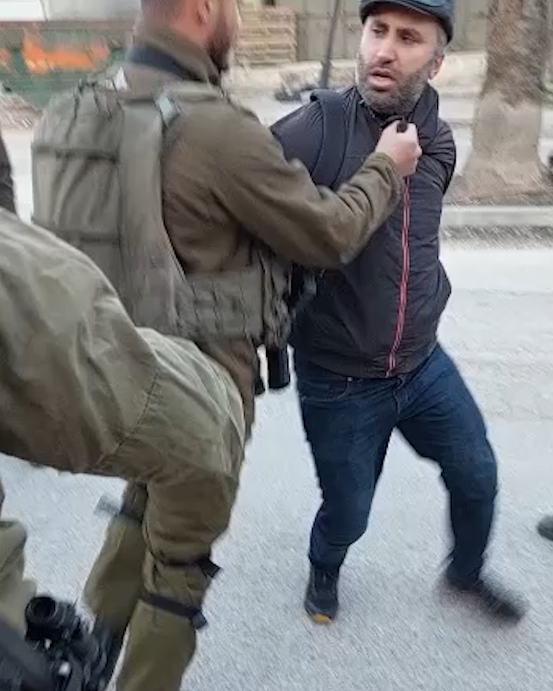 ويظهر الفيديو الذي التقطه نشطاء تجمع شباب ضد الاستيطان جندي وهو يخنق ويعتدي ويضرب بالضرب على الناشط عمرو ويلقيه ارضا.