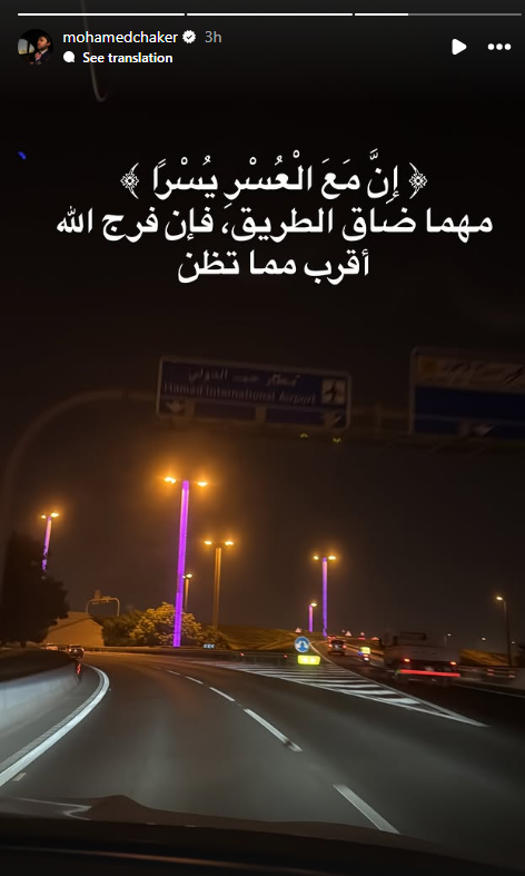 الصورة التي شاركها محمد التُقطت على الطريق المؤدي إلى مطار حمد الدولي في الدوحة، ورفقها بآية قرآنية مؤثرة: “إِنَّ مَعَ الْعُسْرِ يُسْرًا، مهما ضاق الطريق، فإن فرج الله أقرب مما تظن”.