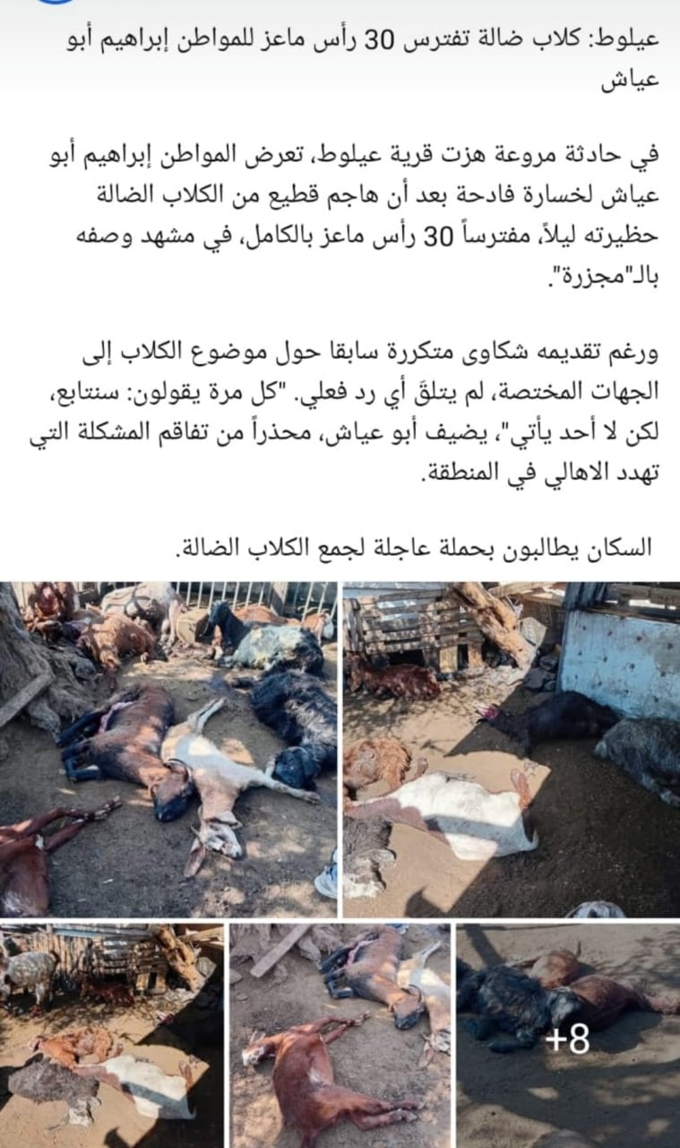 وفي بلدة عيوط، وقعت حادثة مشابهة أسفرت عن خسارة نحو 30 رأس ماشية، ما أثار موجة غضب بين المزارعين الذين طالبوا بتفعيل آليات الرقابة البيطرية ومكافحة الكلاب الضالة.