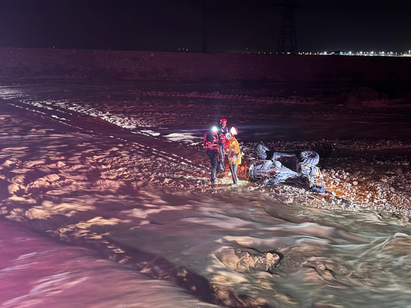 وصرح كايد ظاهر الناطق الرسمي للإعلام العربي لسلطة الإطفاء والإنقاذ، بأن مركبة من نوع تراكتورون انقلبت داخل مجرى الوادي وعلق ثلاثة أشخاص في تدفّق المياه، وباستخدام معدات خاصة للإنقاذ في المياه نفّذ رجال الإطفاء عملية تخليص معقّدة مع الحفاظ على سلامتهم وسلامة العالقين.
