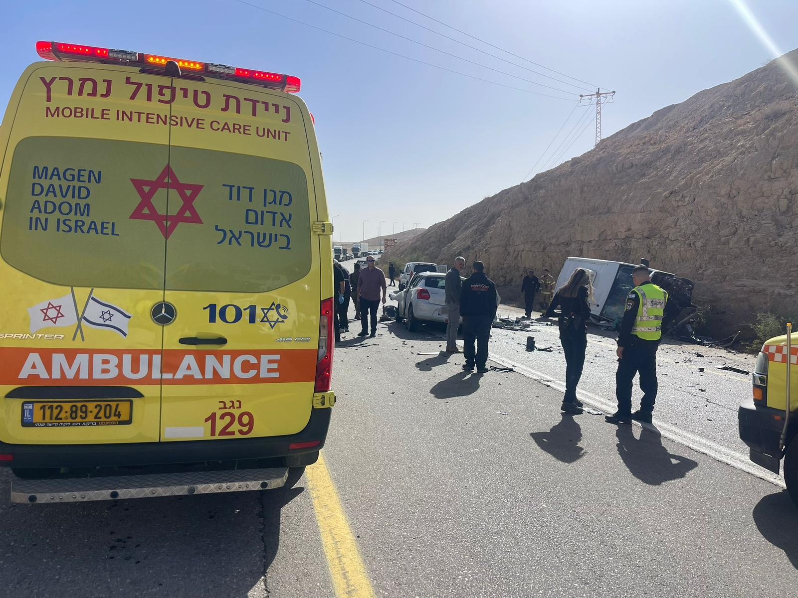 وقال الناطق بلسان نجمة داود الحمراء في بيان له مساء اليوم: " تلقى مركز الإسعاف 101 التابع لنجمة داود الحمراء في منطقة النقب بلاغا عن حادث طرق بين مركبتين على شارع 25 قرب مفرق تسافيت.