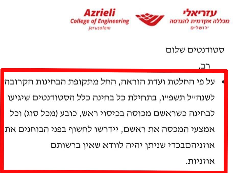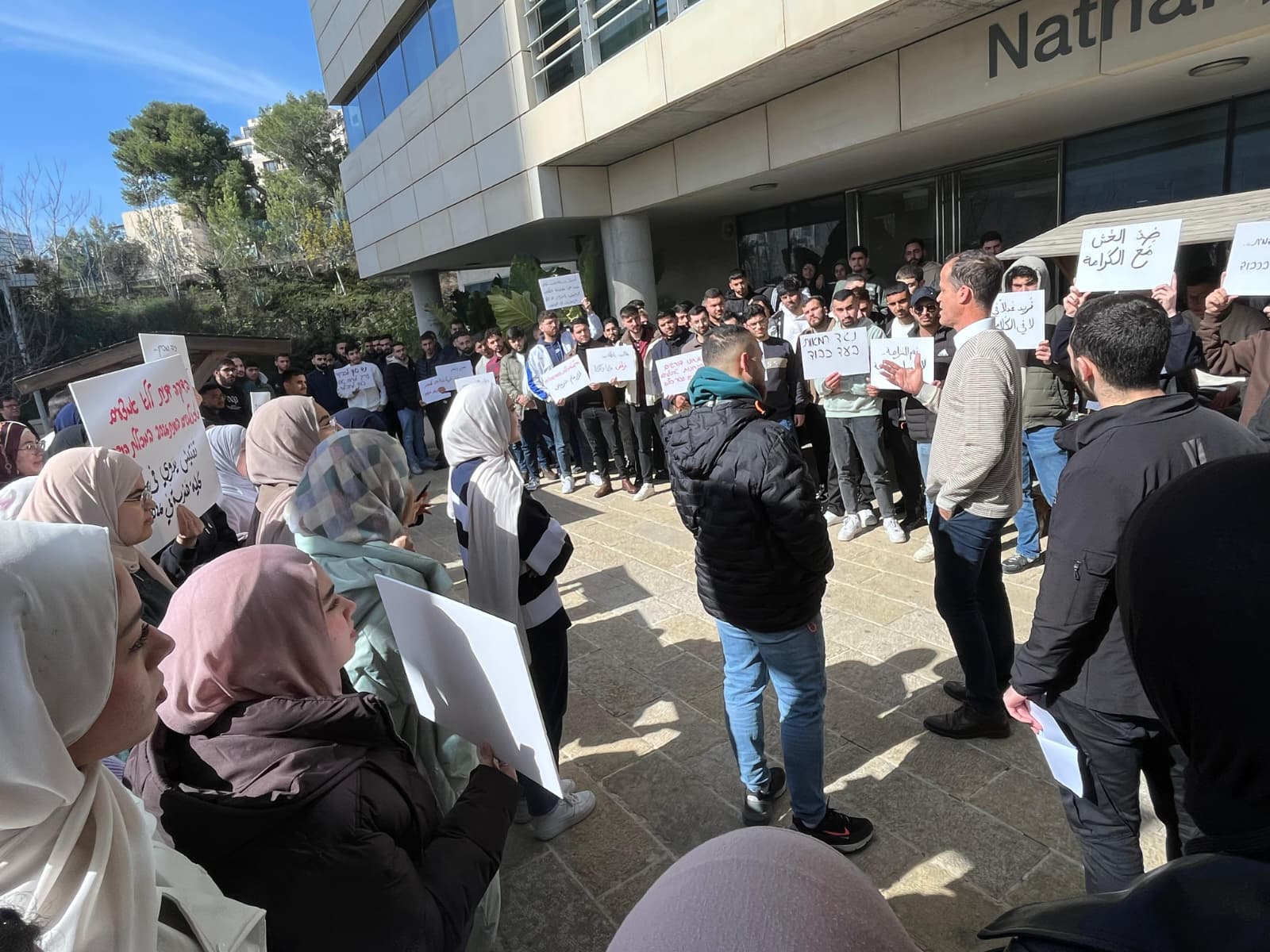 وقفة احتجاجية لطلاب عرب في كلية عزرائيلي بالقدس ضد سياسة تفتيش غطاء الرأس التي تمسّ بخصوصية الطالبات المحجبات قبل الامتحانات